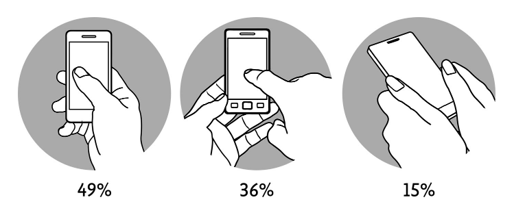 Perchè il pollice è così importante? Perchè ci permette di compiere operazioni con una sola mano sui nostri smartphone, quindi gli elementi importanti per il nostro business come i pulsanti di aggiunta al carrello, richiesta di informazione o di download (secondo i nostri obiettivi), dovrebbero essere facilmente raggiungibili. Infatti ,come è emerso da una ricerca di Josh Clark, il 49% degli utenti utilizza il proprio device mobile con una mano sola e il pollice risulta essere proprio il dito preferito per il tap, registrando che il “ditone” effettua il 75% delle interazioni sul telefono.